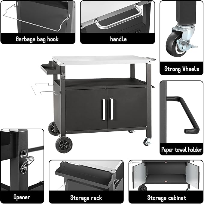 - 【Outdoor Dining Cart】DNKMOR big storage cabinet outdoor dinning cart is made of durable stainless steel. Perfect for placing a pizza oven and accessories, portable grill or griddle; There are 650 S.Q. IN. area ample workplace for outdoor cooking, kitchen or serving.