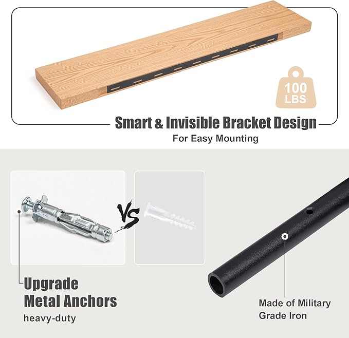 - STURDY & FUNCTIONAL: Not only does the floating shelf showcase the natural grain pattern of the wood, but with unique heavy-duty metal mounting brackets, our floating shelf can hold up to 100 lbs per shelf. The shelves have a flat surface and stable construction, so they are suitable for any room in your home.