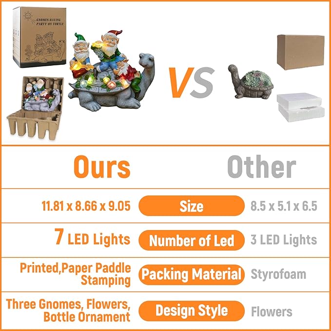- Unique design: The vivid details of this solar garden statue depict these scenes of happy life,Three gnomes are having a party on a turtle, one playing guitar, one drinking, and one sleeping. The turtle slowly brought them home. making it a beautiful and lovely solar garden statue. Dimensions of 11.81X9.05X8.66 inches.