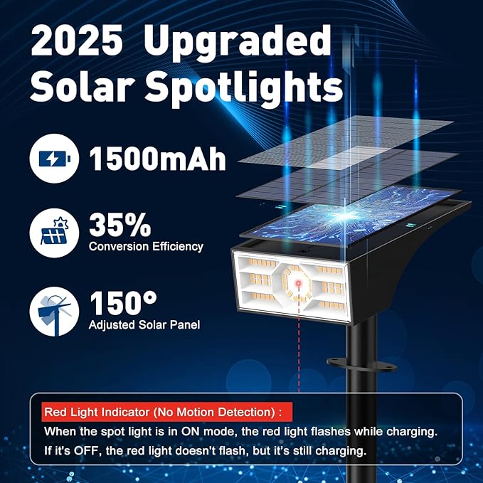 - ใ๐๐จ๐ง๐ -๐๐๐ฌ๐ญ๐ข๐ง๐ ๐๐ฅ๐ฅ๐ฎ๐ฆ๐ข๐ง๐๐ญ๐ข๐จ๐งใ Equipped with 56 LEDs, our solar spotlights create the perfect lighting effect wherever they are placed. The 150ยฐ adjustable head allows you to direct light exactly where you need it. Harness the power of the sun to brighten your garden without high electricity costs. With a maximum brightness of 1000 lumens, these solar landscape spotlights provide 10-24 hours of illumination depending on charge timeโlonger, brighter, and more durable than other solar spotlights on the market.