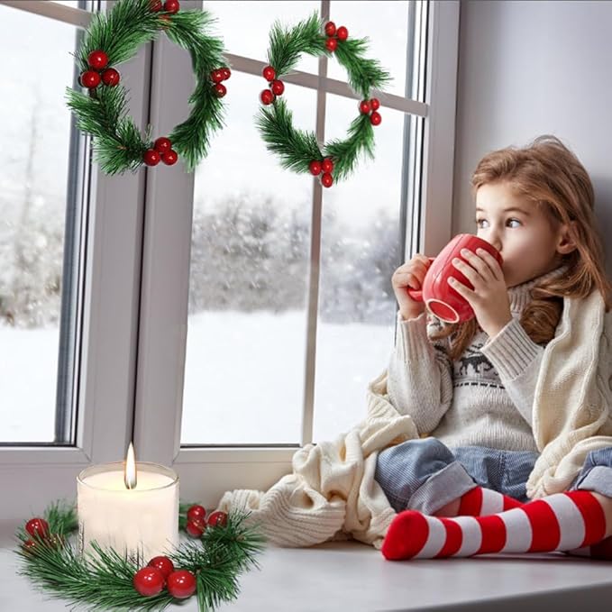 • Delicate Christmas Element: This mini Christmas wreath pine candle ring, comprised of 4 bunches of 12 vivid red berries and lush lifelike green pine needles, full of Christmas atmosphere, which can easily match with other Christmas ornaments, creating a cozy ambiance during the holiday season, bring you a pleasant visual enjoyment