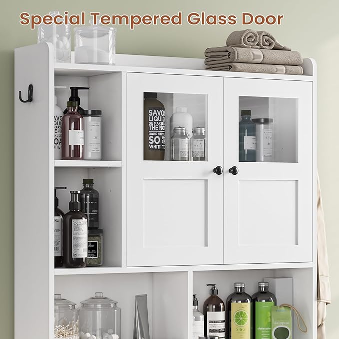 - 【What will you get?】Never worry about having too little space in your bathroom again! This above toilet storage cabinet comes with 2 tempered glass doors, 6 open shelves, 15.7'' deep vertical cabinet and toilet paper holder. Open shelves provide quick access to everyday essentials. Hidden storage space can be used for privacy items. All shelves are adjustable and can be used to store items at different heights. Ensure your bathroom stays organized.