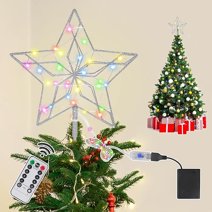 - Convenient Remote Control And Extra Battery Box (Battery not include):Christmas star topper came with timer remote control which includes 8 mode strobe light options,brightness- and brightness+. An extra Battery Box could lighted Christmas tree topper without charger.Perfect on Christmas decorations