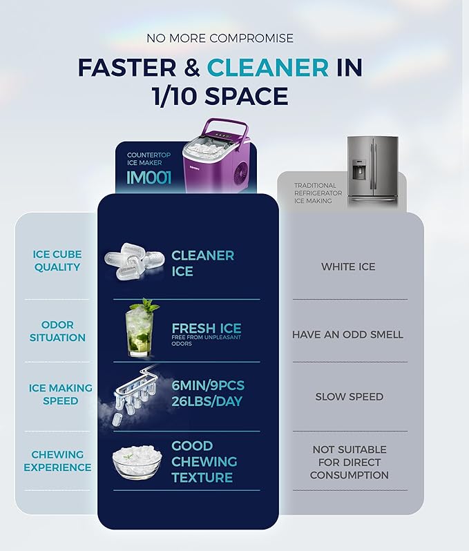- 6 Mins Ice-Making & Ultra Quieter: Our Euhomy ice maker only takes 6mins that will enjoy the first batch of fresh bullet ice. With a 1.2L water tank and powerful compressor, the portable ice maker easily makes maximum ice capacity to 26lbs ice per day and holds up to 1.3lbs ice at a time. Also, our ice maker is not only excellent in refrigeration, but also at less than 45db normal noise, ensuring a comfortable and quiet environment to enjoy ice-making, similar to a working freezer