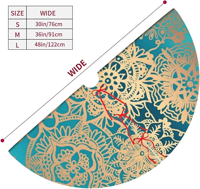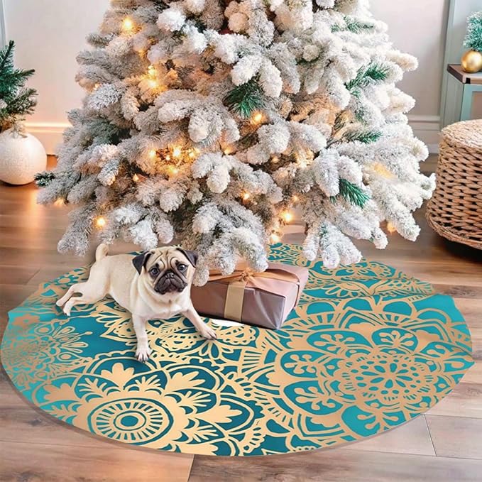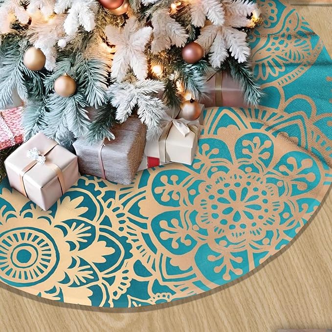 48" Large Christmas Tree Skirt, Elegant Teal Green Mandala Pattern Pattern Tree Mat Base Cover for Xmas Festive Holiday Party Decoration Ornaments