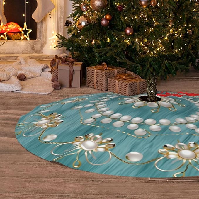 36" Christmas Tree Skirt with Elegant Aqua Pearl Christmas Angel Pattern Turquoise Tree Mat Base Cover for Xmas Festive Holiday Party Decoration Ornaments