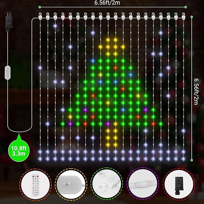 - 300+Light Patterns: More than 300 pre-set static and dynamic patterns for you to pick, you can find cool light pictures on this curtain fairy lights for every festival. You can choose to display Christmas tree, Gift Box, Santa Claus, Candy Canes, pumpkin, ghost, cat, Heart shapes, American Flag, unicorn, etc. Whether it’s Halloween, Thanksgiving, Christmas, New Year, Valentine’s Day, Easter, 4th of July Independence Day, these holiday curtain lights are the ideal decoration. (Note: The images will look better with flat wall or background behind the smart curtain string lights)