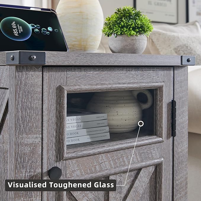 JXQTLINGMU Farmhouse End Table with Charging Station, 18'' Rustic Nightstand with Barn Door & Adjustable Shelf, Wooden Sofa Side Table with 3-Tier Storage for Living Room, Bedroom, Gray