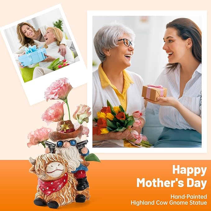 Solar Highland Cow Gnome Statue - Hand-Painted Resin Outdoor Decor for Garden & Yard, Unique Mothers Day Birthday Gifts for Grandma Women (Weatherproof)