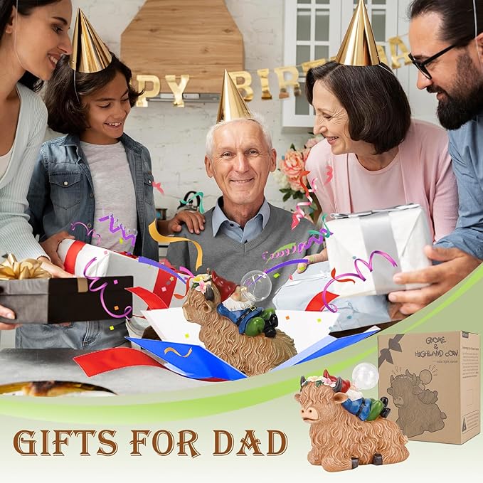 - 【Highland Cow Gnome】ArtTerpnica's funny statue features a unique design: a gnome leisurely lying on the back of a highland cow, hands behind his head, legs crossed, and blowing a transparent bubble. At night, the flower on top of the highland cow’s head and the gnome’s bubble emit a warm glow, adding a touch of fun and warmth to your garden. This statue is an ideal choice for outdoor decor.