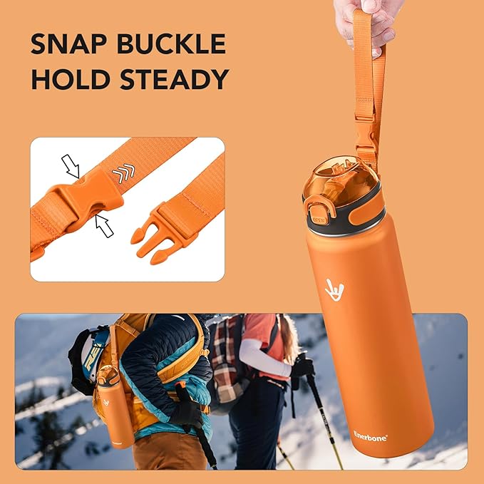Enerbone 32 oz Insulated Water Bottle, Stainless Steel Bottle with Carrying Strap, Double-Wall Vacuum Insulation Design, Leakproof Sports Bottle with Straw, Keep Drinks Cold or Hot for Hours