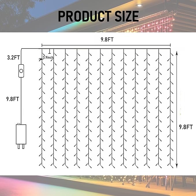 - 16 Million Colors & Multiple Scenes: Transform your holiday decorations with smart Christmas curtain lights that offer an incredible 16 million colors and various modes. The size is 9.8 FT X 9.8 FT, the lead length is 13 FT, and the horizontal distance between each lamp bead is 3.9 inch. Perfect for enhancing the atmosphere during Christmas, Halloween, 4 of July, Easter, Valentine's Day, St. Patrick's Day, Thanksgiving, New Year, weddings, and birthdays.