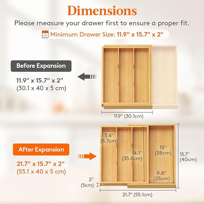 - Expandable Design: This utensil drawer organizer expands from three to four compartments and measures 21.7 x 15.7 x 2 inches (55.1 x 40 x 5 cm) after expansion, providing extra storage space. Its adjustable width range (11.9 - 21.7 inches) ensures a perfect fit for most drawers