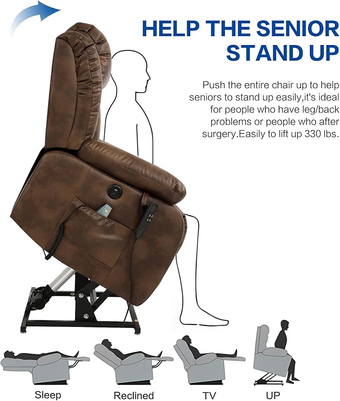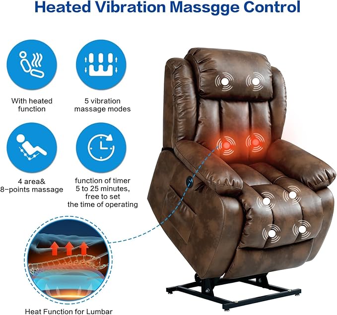 - 【Heating and Massage】The lift chair has eight massage points; three massage modes, the waist has a heating system that can provide waist care and heating for the elderly or other people in need; at the same time, the temperature-controlled heating system, 113℉~140℉, when it reaches 140℉, it will automatically cut off the power and continue to cool down to 113℉ before heating.