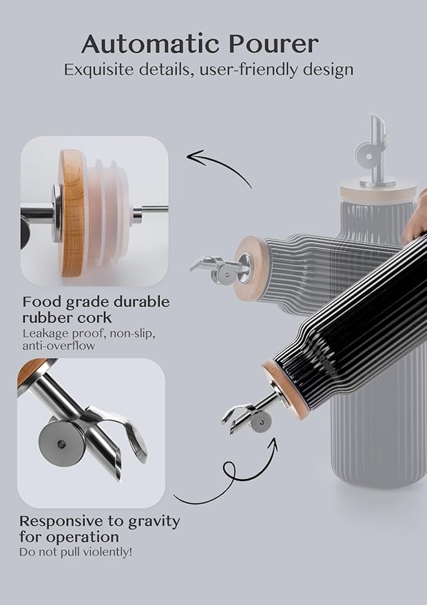 - Gravity-Driven Auto Spout: The gravity-driven spout opens automatically when the bottle is tilted and closes when it is upright, offering precise pouring control without drips or spills. Simplify your kitchen with this multi-use oil and vinegar dispenser bottle.