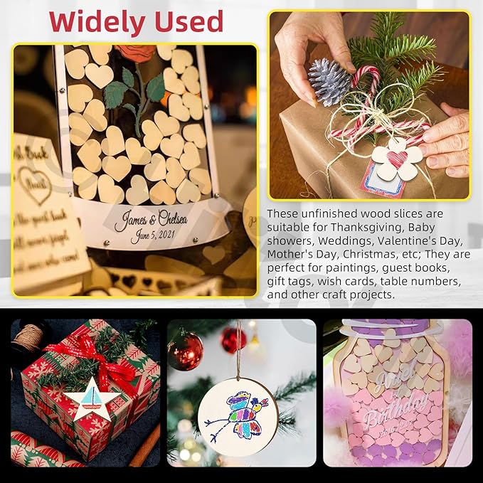 - 🎈【Wide Application】Blank wood ornaments are widely used in daily DIY crafts, such as painting, message boards, gift labels, wish cards, table numbers, and other craft projects. They are suitable for use as decorations on Thanksgiving, weddings, Valentine's Day, Mother's Day, Christmas, and other holidays and a good choice for adding more interaction.