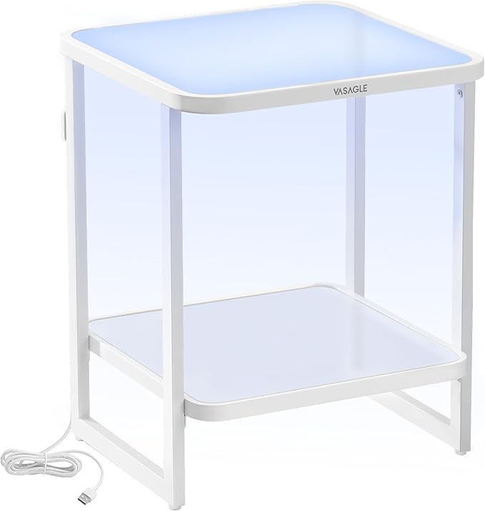 VASAGLE End Table, 2-Tier Side Table with LED Lights, Modern Nightstand, Square Bedside Table, Frosted Glass, Bottom Shelf, for Bedroom, Cloud White and Pearl White ULET232W01