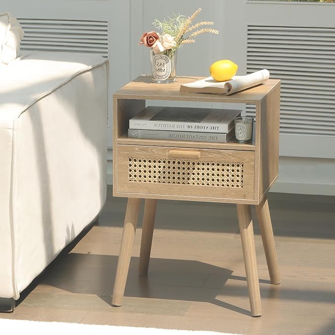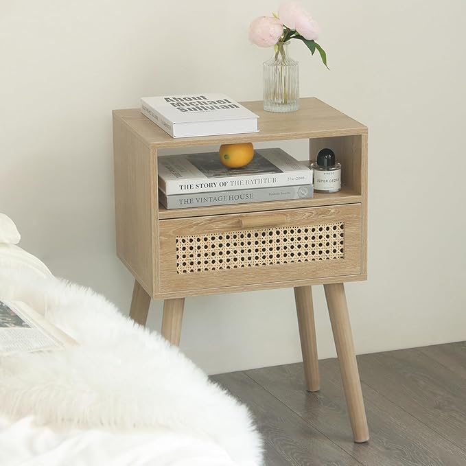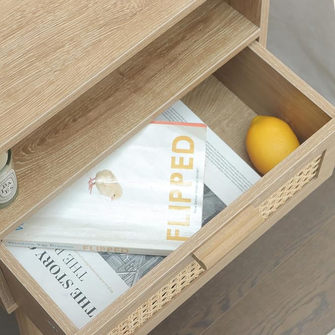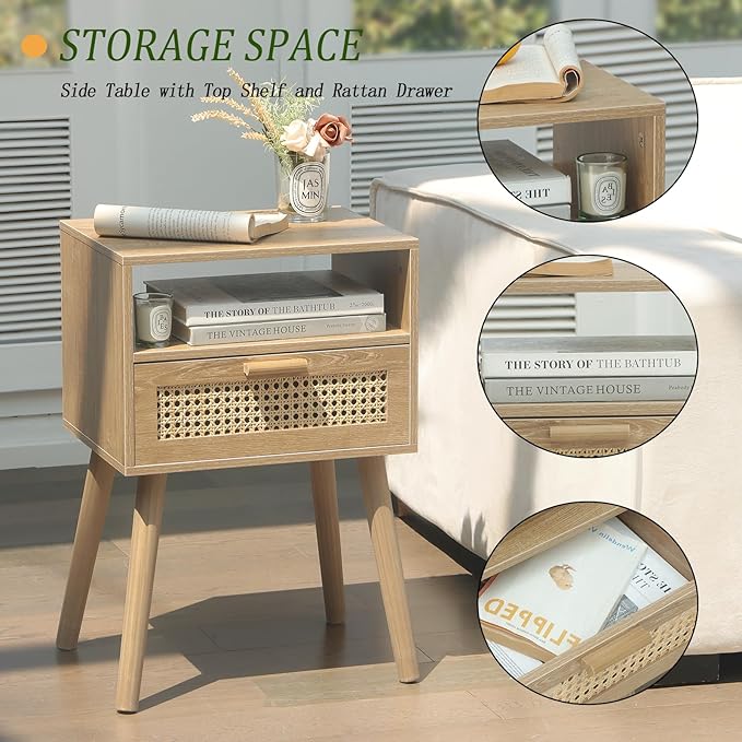 - Stylish and Practical Storage: The bedside table features a two-tier storage design, a unique extra top shelf and a spacious tabletop with a natural rattan drawer to fit your snug home and provide more space to put down books, snacks, drinks