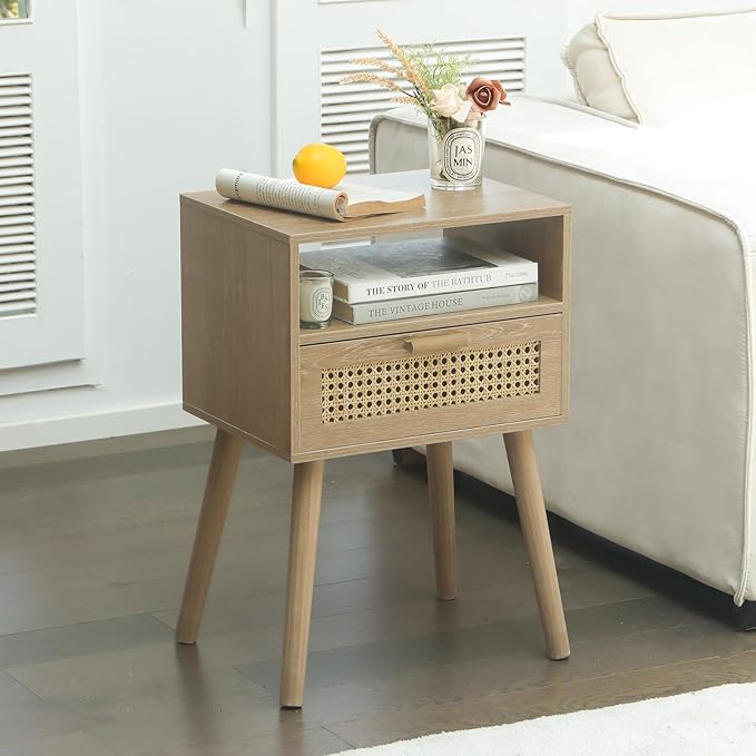 MaxSmeo Rattan Nightstand with Drawer, Mid Century Modern Wood Bedside Table for Living Room, Bedroom and Small Spaces (Rustic Walnut)