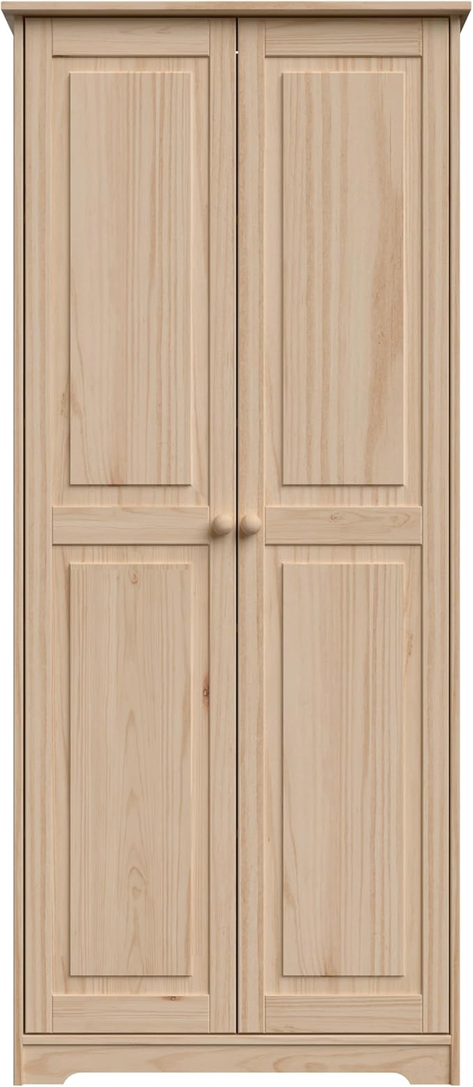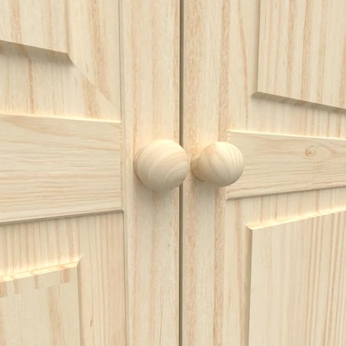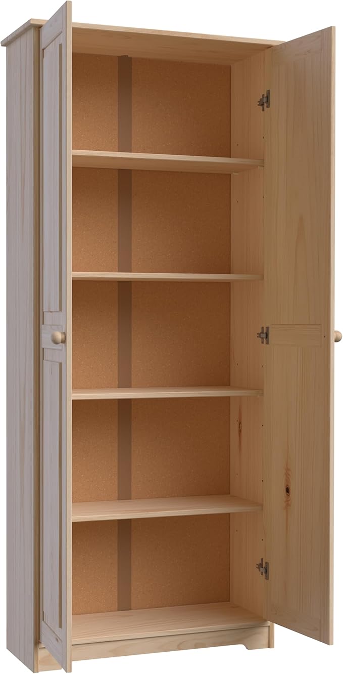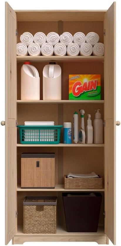 - SOLID WOOD KITCHEN AND LAUNDRY PANTRY CABINET WITH 2 DOORS - constructed from solid wood for a durable, long-lasting design and features 3 adjustable + 1 fixed shelves providing room for all your supplies. Unfinished for versitility