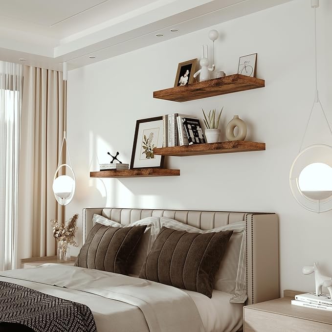 - Well-designed Floating Shelves - The rustic style floating shelves combining both practicality and style. These shelves offer a generous deeper and thicker surface, perfect for organizing daily sundries without taking up valuable floor space. The various of selected colours finish adds a cozy, natural element,display your art pieces on the wall to decorate your home, and make it full of aesthetic flare.