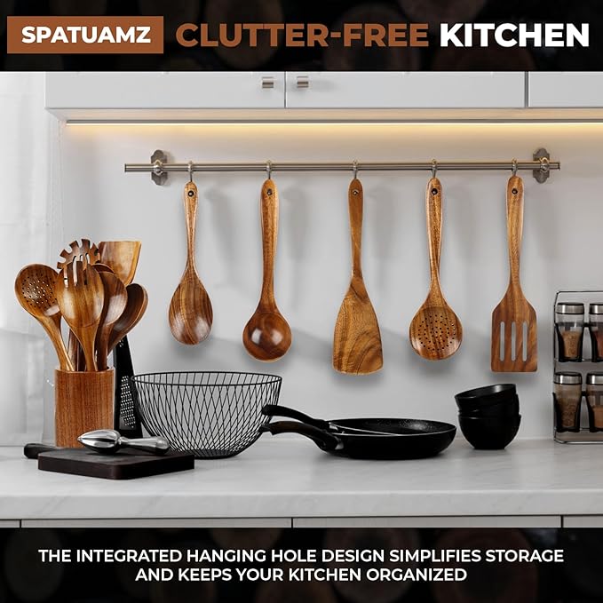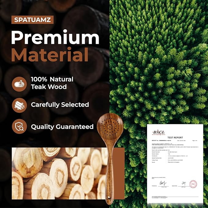 - 【100% Natural Teak Wood – Safe & Healthy】: Our wood utensils set is made from 100% natural teak wood, ensuring it’s both safe and healthy for everyday use. Please note: Current packaging may say “Natural Wood,” which refers to this same authentic teak material – updated packaging with the correct teak wood labeling is already in progress. These wooden cooking spoons are free from any harmful substances, making them an ideal choice for those seeking high-quality, harmless kitchen utensils