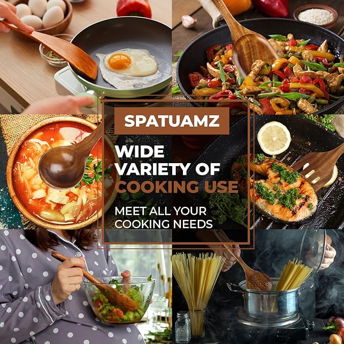 - 【All-in-One Multi-Functional Design】: This complete wooden spoon set for cooking offers versatile functionality, covering all your kitchen needs. From stirring to flipping and serving, this set eliminates the need for extra tools, saving you both time and money for all your cooking tasks