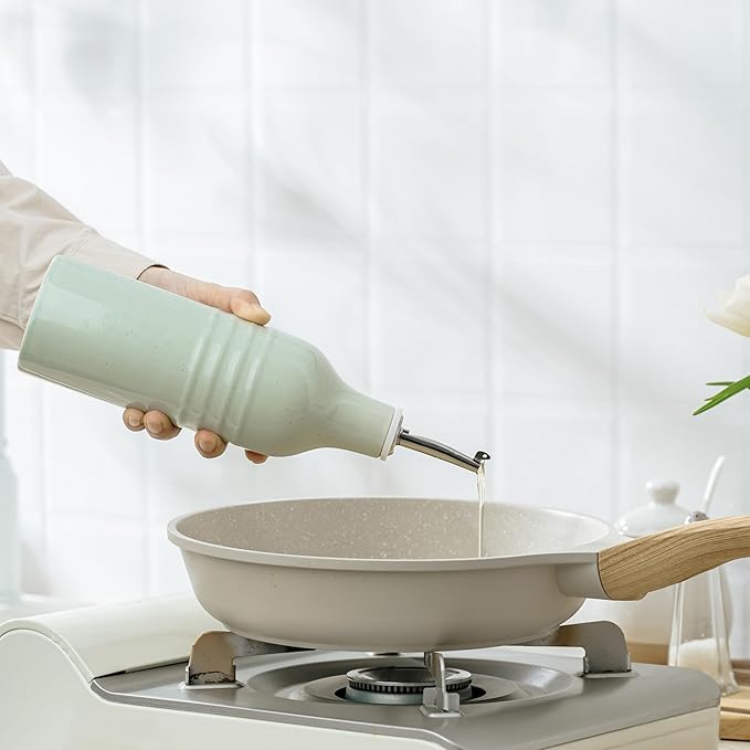 famiware Jupiter 16oz Ceramic Olive Oil Dispenser Bottle, 1 Piece Oil Dispenser for Kitchen with Stainless Steel Pourers, Suitable for Storage Vinegar, Soy Sauce, Coffee Syrup, Light Green