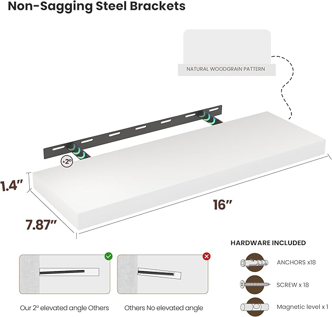 - Premium Wooden Floating Shelves -Unlike others, they are beautifully-finished, fantastic-smelling solid pine,and they are handcrafted out of finest solid pine wood measuring 16" x 8" x 1.38",revealing its own character of knots and natural wood grain, making each ledge a little different but equally stunning.