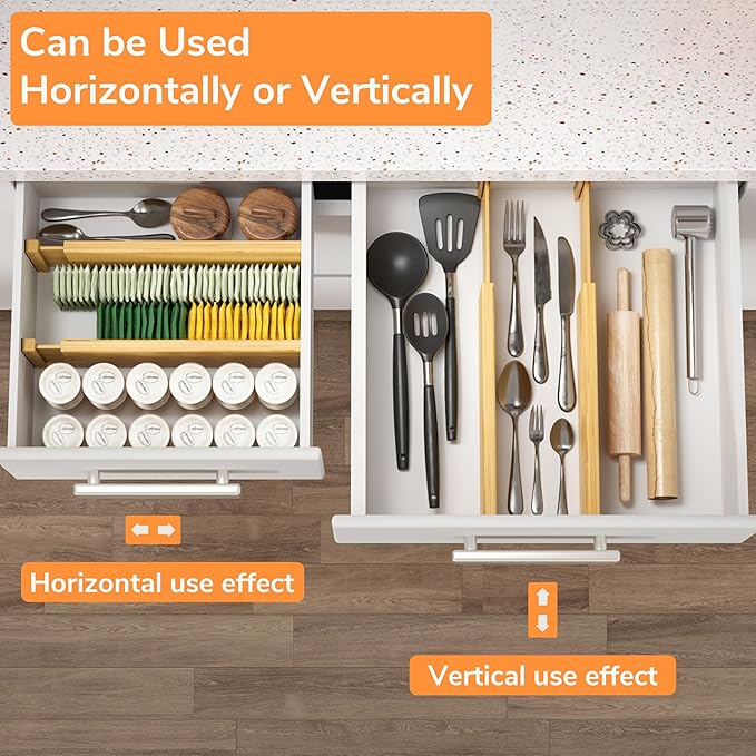 - No Need to Install: This kitchen drawer dividers have a built-in spring structure that eliminate the need for tedious installation steps; Simply push it gently and squeeze both sides inward, the pin comes off instantly and is ready for use