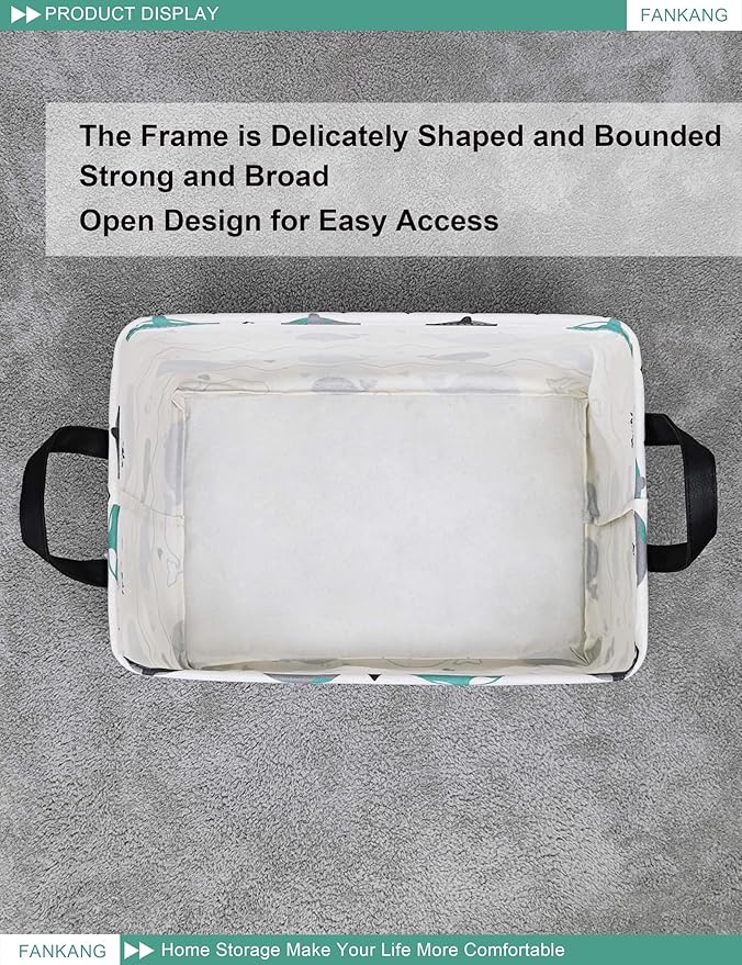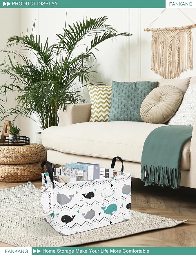 FANKANG Storage Bins, Nursery Hamper Canvas Laundry Basket Foldable with Waterproof PE Coating Large Storage Baskets for Kids Boys and Girls, Office, Bedroom, Clothes,Toys(Rec-whales )