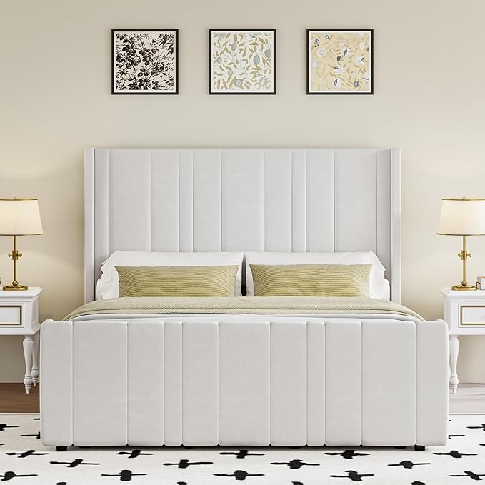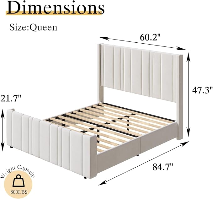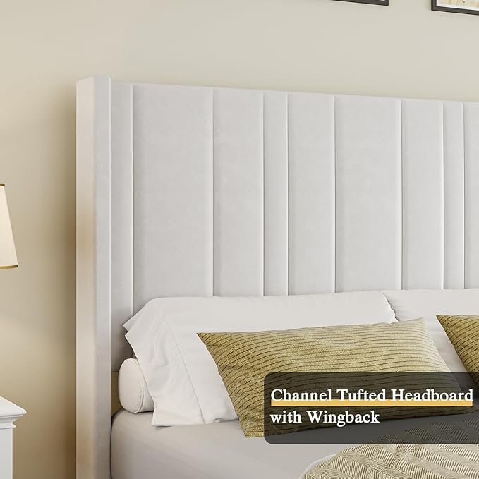- Soft Velvet: Wrapped in comfortable soft velvet, the white bed frame showcases a elegant design with modern clean lines and low profile bed. The Vertical channel tufted of the queen size bed frames with headboard in velvet and fully padded will decorate your room