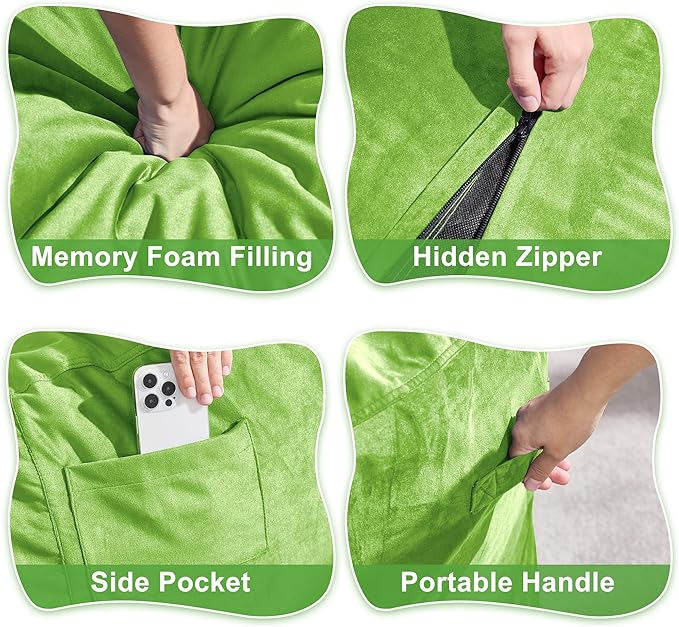 - Convenient Design: Our adult bean bag chair is designed with handle so you can move the giant bean bag chair wherever you want. The adult bean bag chair has a medium sized pocket on the side to store your phone, remote control, books and some small items. With the hidden zipper, you can remove the bean bag cover and throw it in the washing machine for cleaning.