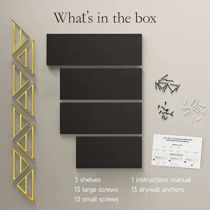 - Create a stylish display with our rustic wall-mounted shelves. Perfect to display decor, these offer ample space for books, decor, and more. The Black Gold finish makes them a versatile addition to any room, enhancing your overall decor