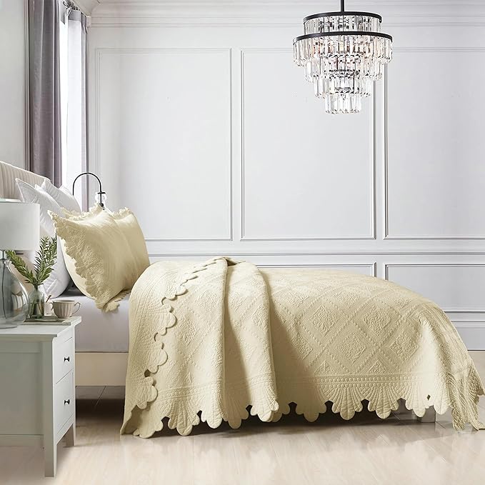MarCielo 3-Piece 100% Cotton Oversized Bedspread Lightweight Quilt Coverlet Embroidery Farmhouse Bedding Set (Tk Beige Khaki, Oversized Queen (100"x106"))