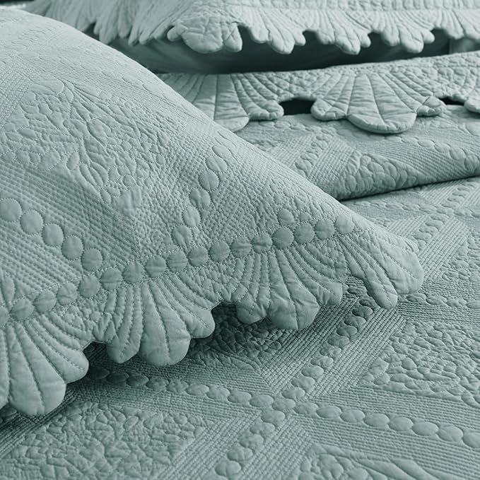 MarCielo 3-Piece 100% Cotton Oversized Bedspread Lightweight Quilt Coverlet Embroidery Farmhouse Bedding Set (Tk Aqua Green, Oversized Queen (100"x106"))