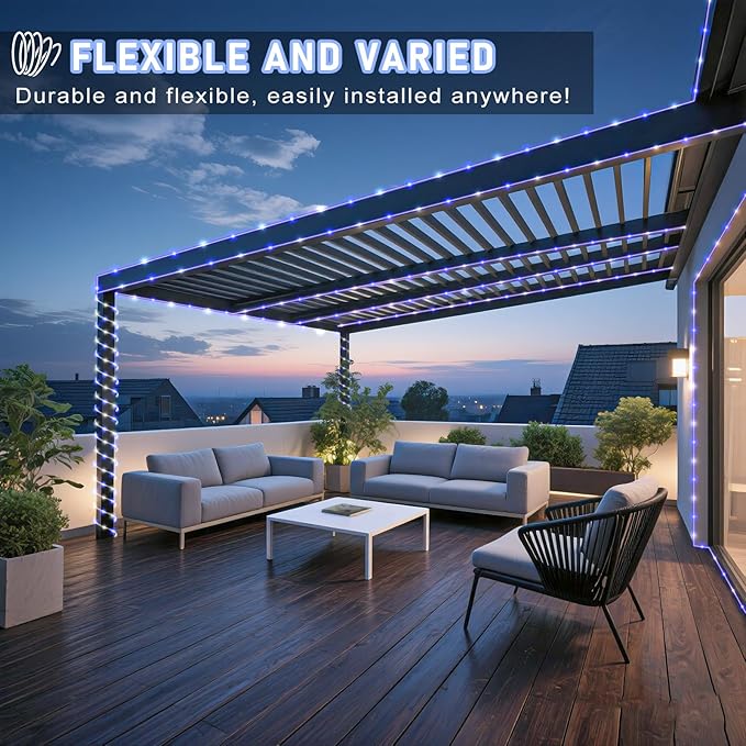 - 【Upgraded Connectable Rope Lights】- Our rope lights for outside feature a 66ft lighting length with a 6.6ft lead wire, total 72.6ft length. LED bulbs are spaced 4 inches apart to provide bright and soft lighting. The led rope lights can be connected end to end up to 5 sets, long enough to meet your creative lighting decor needs.