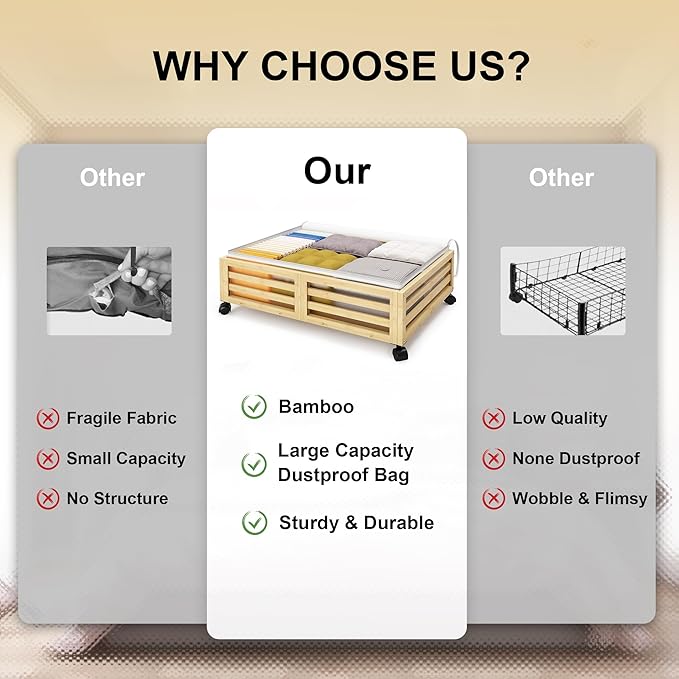 - 【360° Rotating Wheels】Features detachable wheels for easy sliding in and out from under the bed; convenient access in tight spaces