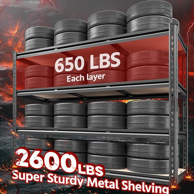 - 【2600LBS Capacity Garage Storage Shelves Heavy Duty】REIBII heavy duty garage shelving is constructed with reinforced steel legs and rolled-edge columns, featuring a high-quality metal frame combined with durable 7mm thickened MDF board. Each metal shelf, supported by beams underneath, has a weight capacity of up to 650 lbs, contributing to an overall bearing capacity of 2600 lbs. This design enhances the sturdiness of the garage shelves and enables efficient storage of numerous items.