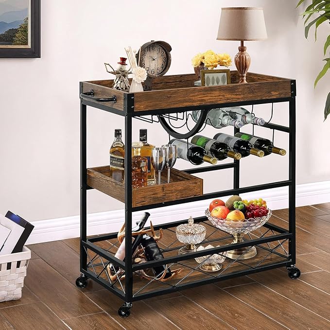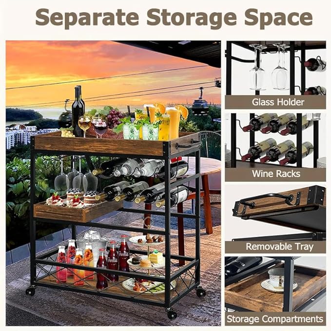 - 【Easy Installation】This vintage bar cart comes with step-by-step instructions and assembly tools. Each accessory is labeled. Thanks to the clear instructions and clearly labeled parts, you can assemble the rolling bar cart with removable tray. Get ready to enjoy your favorite wines and dishes!