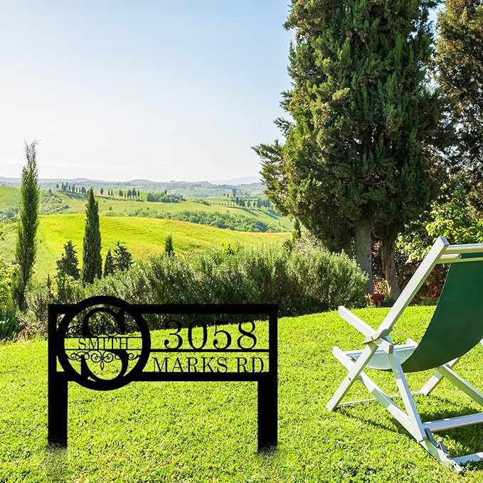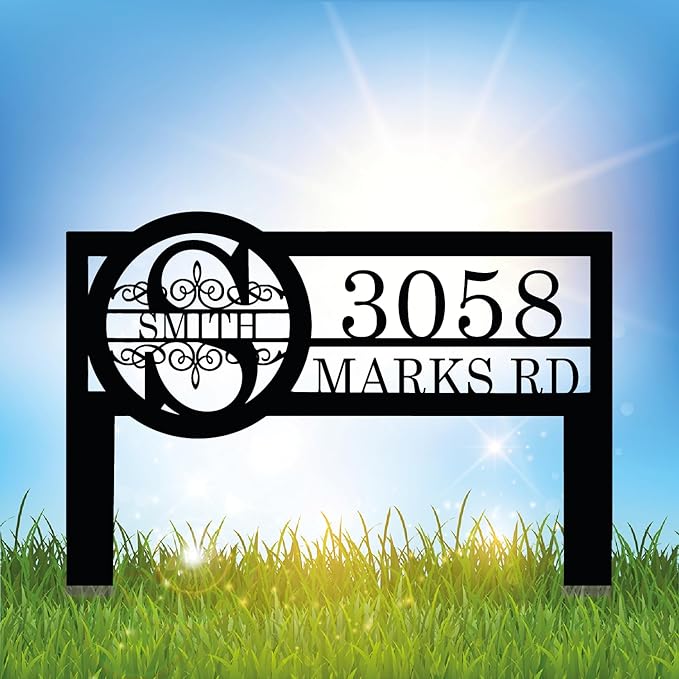 Personalized Metal Yard Address Sign with Last Name and Monogram, House Number Sign for Lawn and Patio