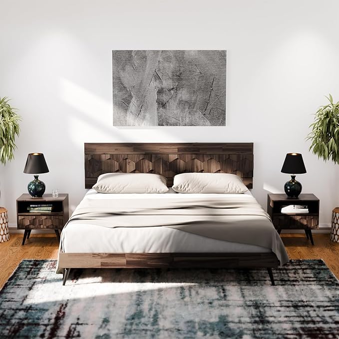 - HANDCRAFTED GEOMETRIC DETAILS: Elevate your space with exquisite handcrafted geometric patterns that seamlessly blend modern and rustic beauty; Come with sleek black metal legs, our solid wood nightstand adds a touch of mid-century style to your home