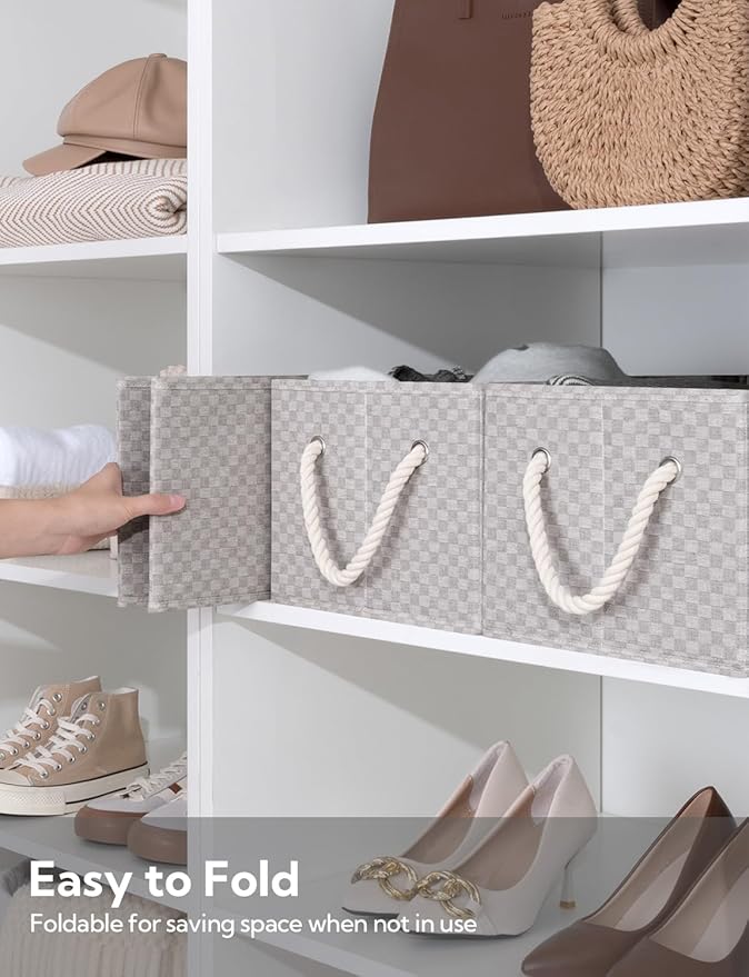 StorageWorks Storage Baskets for Shelves, Foldable Fabric Closet Storage Bins with Handles, Fabric Storage Bins Clothes Organizer, Khaki Check, 3-Pack, Large