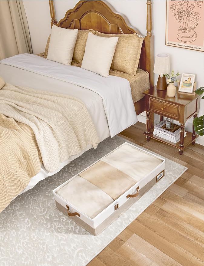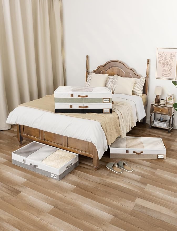 - Underbed storage box featuring thick PU handles on 3 sides for easy accessing, carrying, and retrieving.