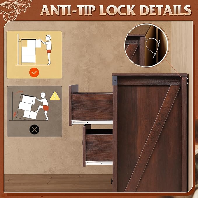 - 🎄【Farmhouse 6 Drawers Dresser】This wooden dresser farmhouse look is heightened by the rustic color finish coupled with the side barn sign and the dark square handle adds a rustic charm. It can be used for bedroom clothing organizer, entryway table, decorative storage for living room.