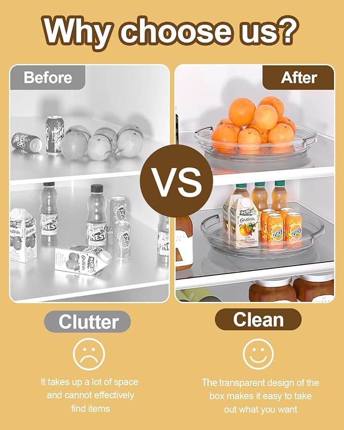 - Versatile Usage: Our clear Lazy Susan organizer enhances the functionality and efficiency of any space. It provides a practical solution for organizing and storing condiments, spices, snacks, cans, medicine, makeup, perfume, and cleaning supplies in your kitchen cabinet, pantry, fridge, countertop, office tabletop, or bathroom.