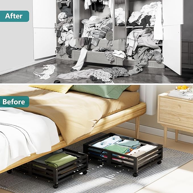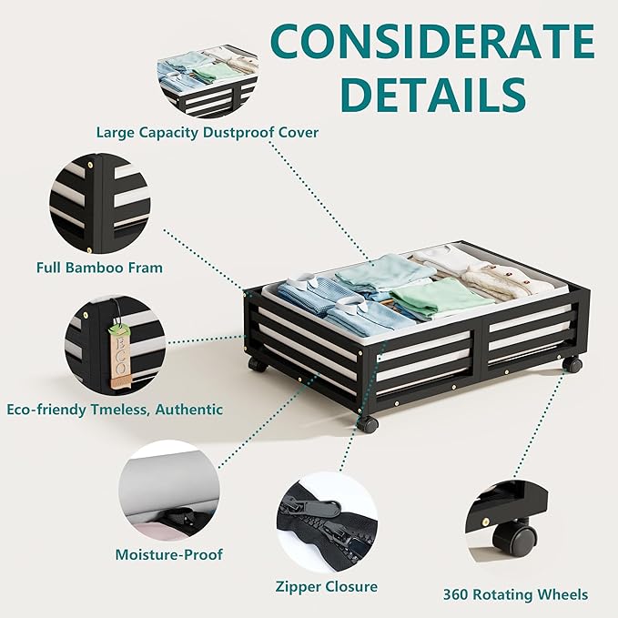 - ๐[Sturdy and Durable] Our under bed storage with wheels is crafted from premium wood bamboo, boasting 4 rotating wheels and a capacity of 120lbs. This 'under bed storage' solution includes non-woven bags for efficient organization of clothes, books, shoes, and toys.