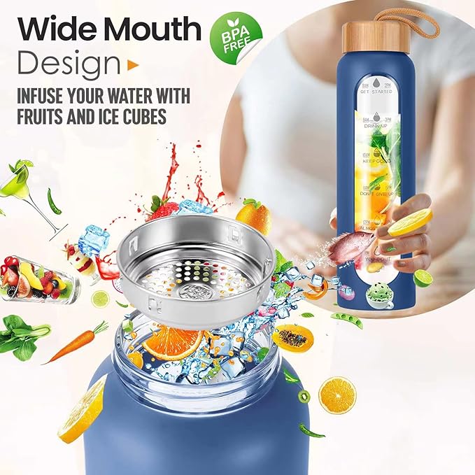 - Innovative and Convenient: The Aqulea wide mouth water bottle glass package comes with a leak-proof glass bottle with bamboo lid, a non-slip protective silicone sleeve for easy grip and maximum impact protection, an 18/8 stainless steel strainer for infusion water bottle, and a retractable brush