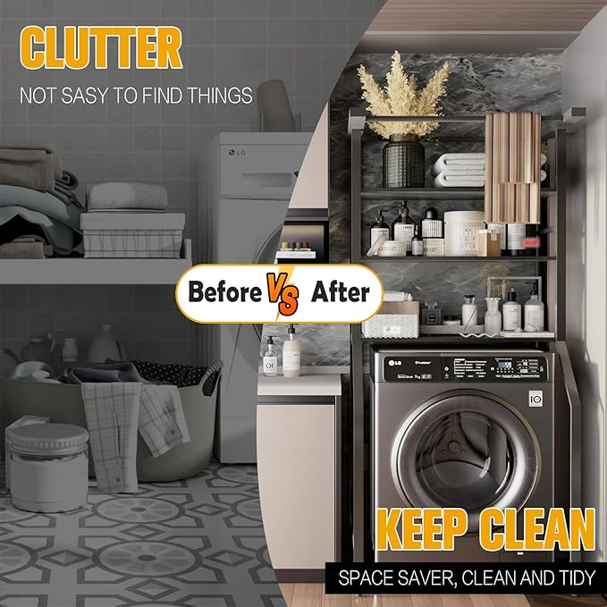 - Durable All-Steel Construction for Superior Stability: This over the washer and dryer storage shelf is made from tough, all-steel materials with extra-thick pipes for excellent stability and durability. Each shelf holds up to 70 lbs, making it perfect for storing heavy items like laundry detergent and baskets without any wobbling.