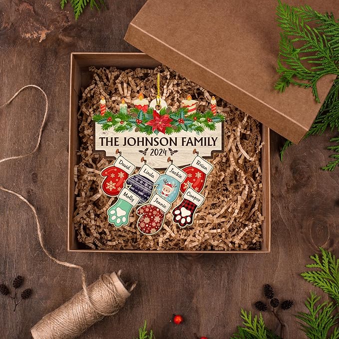 - ๐พ Perfect for Families with Pets - This ornament is designed to include everyone in the family, even furry friends! Choose gloves for each family member and stockings for pets, each with a custom name. Itโs the perfect keepsake to represent the whole family in festive style.
